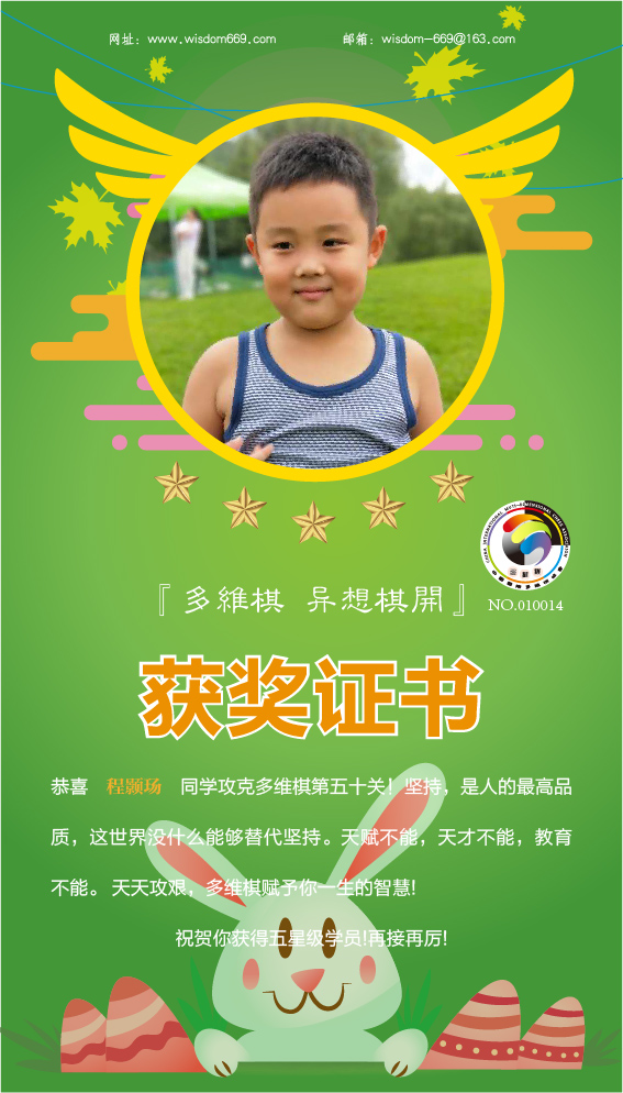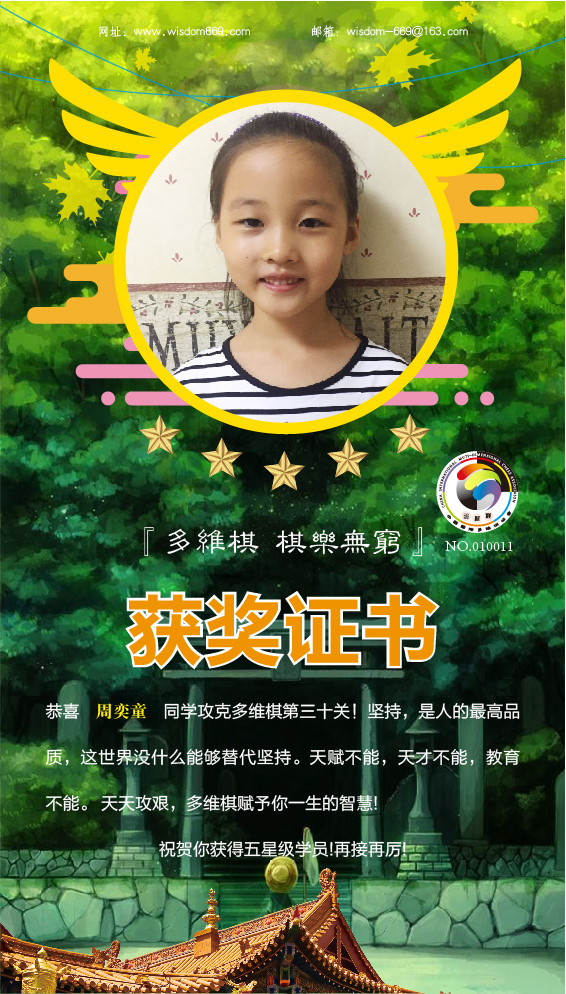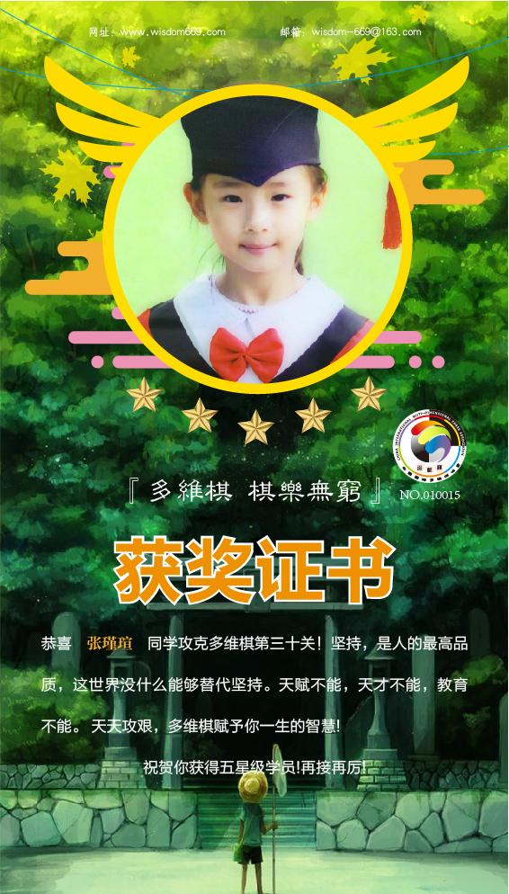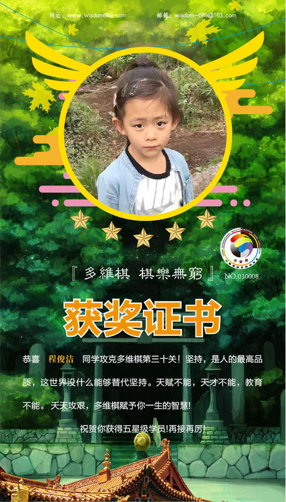 很多家长和孩子开始践行“日行一棋”活动,展示出顽强的毅力和执着的学习态度。目前,才莘浩、周奕童、程俊洁、程颢玚、张瑾瑄等五位小朋友通过自己的坚持,每天不断闯关,获得维思德总部授予的“五星级学员”称号,恭喜他们!希望他们再接再厉,取得更丰硕的成果!