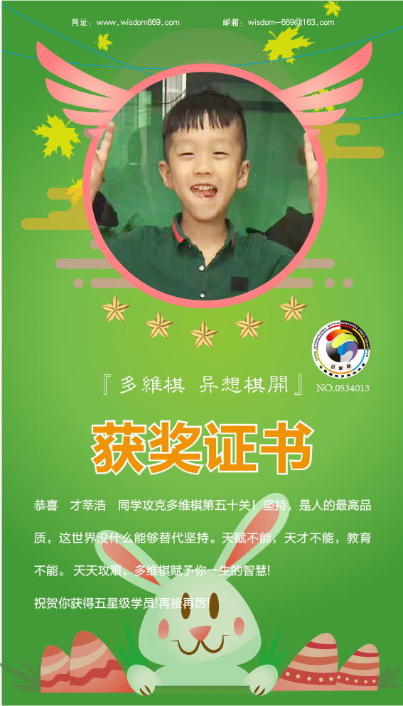 恭喜才莘浩、周奕童、程俊洁、程颢玚、张瑾瑄5位小棋手获得五星级学员称号!