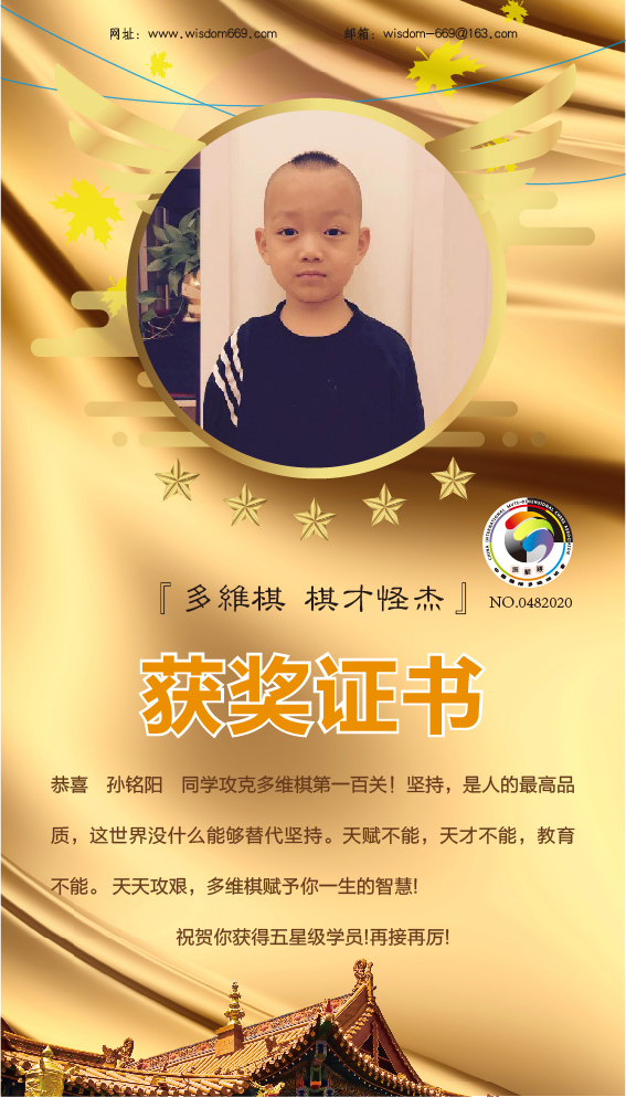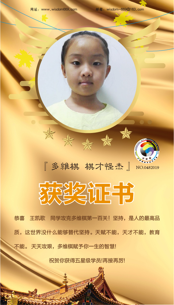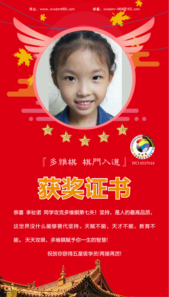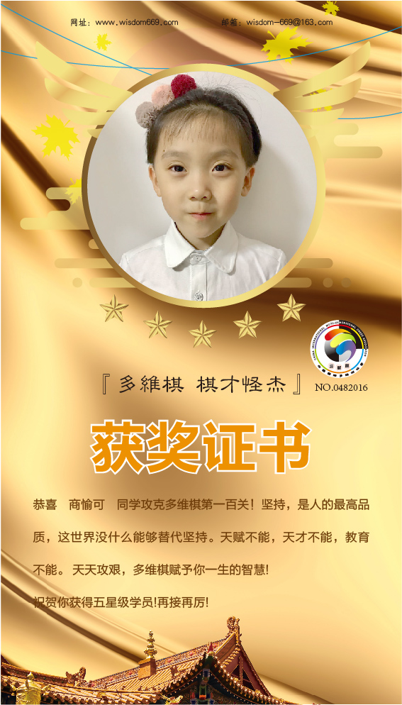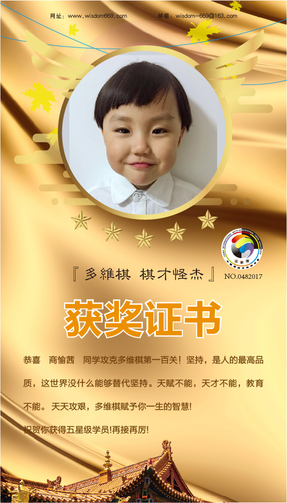 很多家长和孩子开始践行“日行一棋”活动,展示出顽强的毅力和执着的学习态度。目前,商愉茜、商愉可、孙铭阳、王凯歌、李祉诺五位小朋友通过自己的坚持,每天不断闯关,获得维思德总部授予的“五星级学员”称号,恭喜他们!希望他们再接再厉,取得更丰硕的成果!