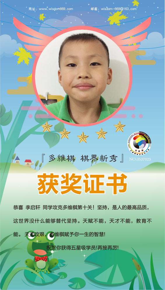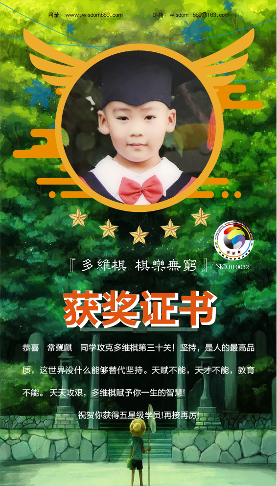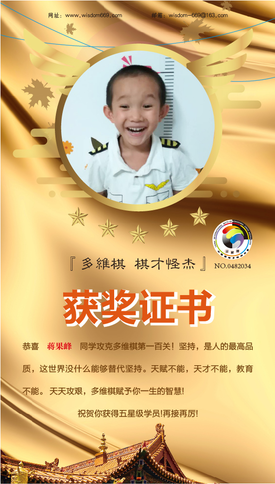 很多家长和孩子开始践行“日行一棋”活动,展示出顽强的毅力和执着的学习态度。目前,蒋果峰、常觐麒、李启轩、赵星涵4位小朋友通过自己的坚持,每天不断闯关,获得维思德总部授予的“五星级学员”称号,恭喜他们!希望他们再接再厉,取得更丰硕的成果!