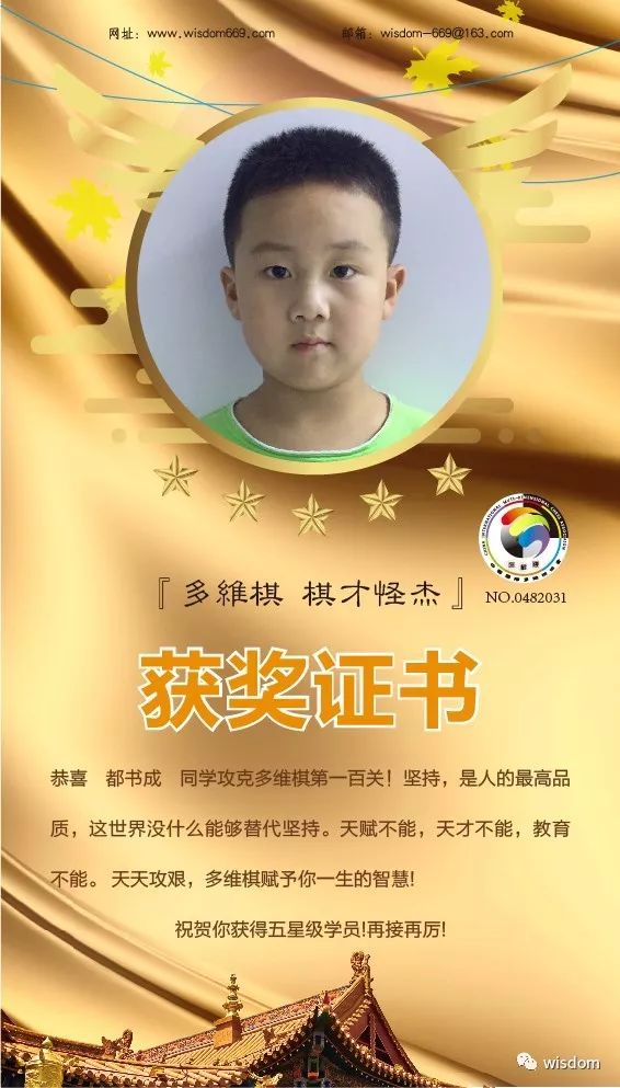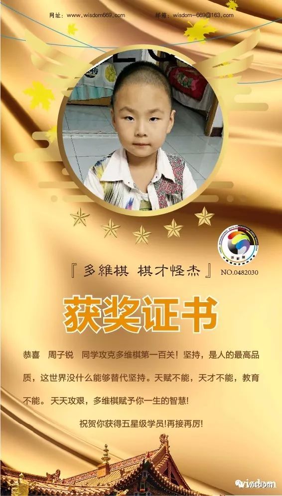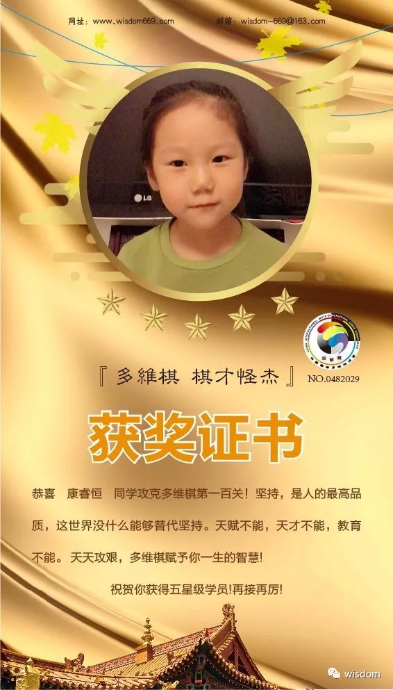 康睿恒、周子锐、都书成3位小朋友通过自己的坚持,每天不断闯关,获得维思德总部授予的“五星级学员”称号(棋才怪杰,100关),恭喜他们!希望他们再接再厉,取得更丰硕的成果!